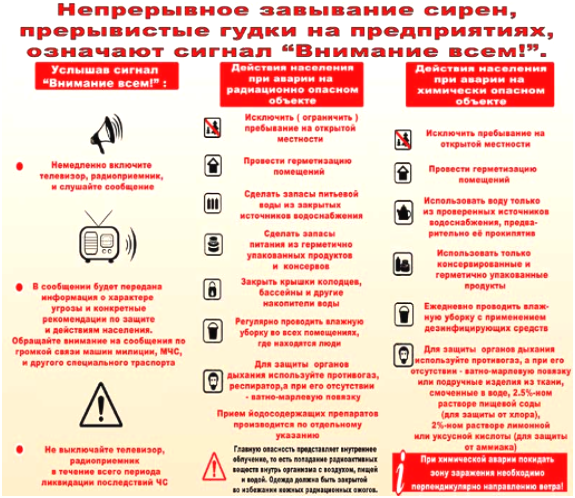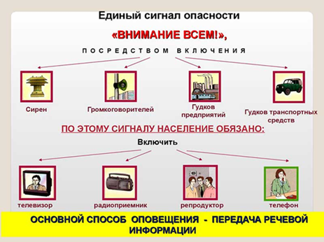 «Внимание всем!» –предупредительный сигнал, самый распространенный способ оповещения населения. Подается с целью привлечения внимания и последующего сообщения об аварии, катастрофе, стихийном бедствии.