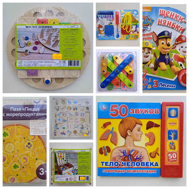 В этот список попали также игрушка развивающая для детей старше 3 лет с маркировкой «ToySib»: «Мемо игра невидимки», сортер «Логическая панель», развивающие игрушки марки «Тимбергрупп»: игра «Ассоциации. Профессии», пазл «Пицца с морепродуктами».